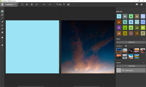 前面我们有提到 RTX 30 系列 GPU 在人工智能、深度学习方面能力很强,因此大部分有相关需求的公司和研究院都会大量采购 RTX 系列显卡。笔者是文科生,并不是很懂这一块,就不班门弄斧了。但笔者发现了两款小白也能用的 AI 应用,足以体现 RTX 系列 GPU AI 算力的强大。第一款是 NVIDIA Canvas,这是一款 AI 绘画应用,只要简单画一个简笔画,AI 就会自动把它补成一副风景画,随着 AI 的逐渐强大,画出来的效果会越来越好。