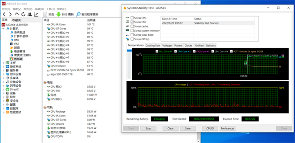 看来 XPS17 9710 的硬件配置是不错的,那么它能否持续输出高性能呢?我们接下来就烤机跑分试试。先使用 AIDA64 进行单烤 FPU,15 分钟后,CPU 温度稳定在了 100℃左右,此时功耗稳定在 55W。这就是 XPS 系列的特色了,温度会高一些,但换来了非常低的风扇噪音,同时由于碳纤维材料的加持,C 面体感温度并不会很高。