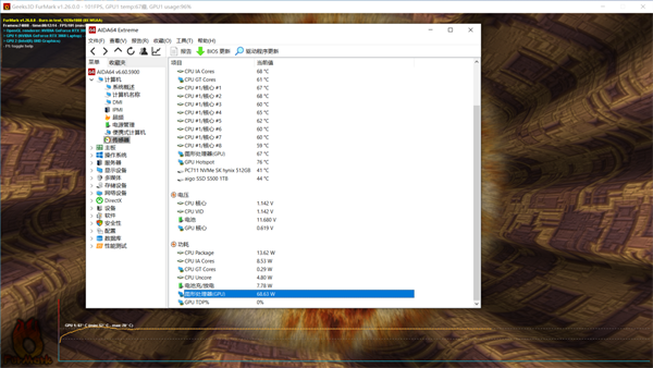 然后我们使用 FurMark 甜甜圈进行单烤 GPU, 在 Dynamic Boost 2.0 动态增强技术的加持下,XPS17 9710 的 RTX 3060 笔记本电脑 GPU 稳定在了 70W 左右的功率,温度稳定在 67℃。性能释放不算很激进,但确实安静。
