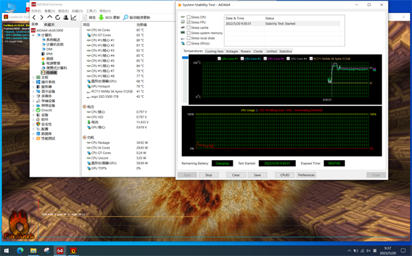 接下来我们同时运行以上两款软件,模拟最大的压力,运行 15 分钟的双烤。15 分钟后 CPU 稳定在 35W、85℃,GPU 稳定在 60W、68℃。也就是说整机最大性能释放约 95W,考虑到它是纯 C 口供电的(适配器 130W), 这个定位显然更偏商务。