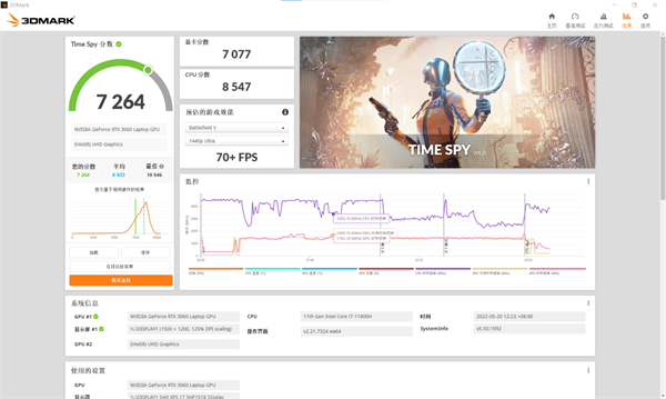 在 3DMark Time Spy 中的 GPU 跑分达到了 7077 分,比 RTX 2060 笔记本电脑 GPU 提升了近 30%,进步还是相当明显的。