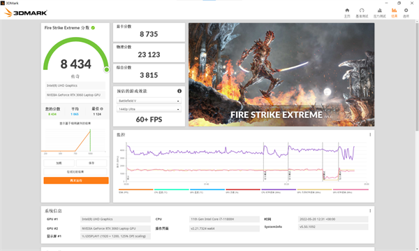 此外我们还跑了一下 3DMark 的 Fire Strike Extreme 测试,实测得分为 8735 分,可以 60 帧流畅运行绝大多数 3A 大作了。