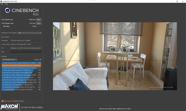 在 R23 中,则获得了单核 1517 分,多核 11925 的成绩。
