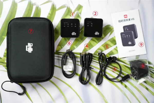 唱吧领夹麦V6采用白色简约风的包装设计,正面产品效果图,背面产品主打卖点。打开包装,是一个黑色收纳包,所有的产品配件都在里面。包装清单:①发射器、②接收器、③单边监听耳机、④Type-C一拖二充电线、⑤手机连接线C转C接头、⑥手机连接线C转3.5mm接头、⑦收纳包、⑧防风毛衣、⑨说明书。建议在使用前仔细阅读说明书,上面有详细的功能介绍和使用方法。