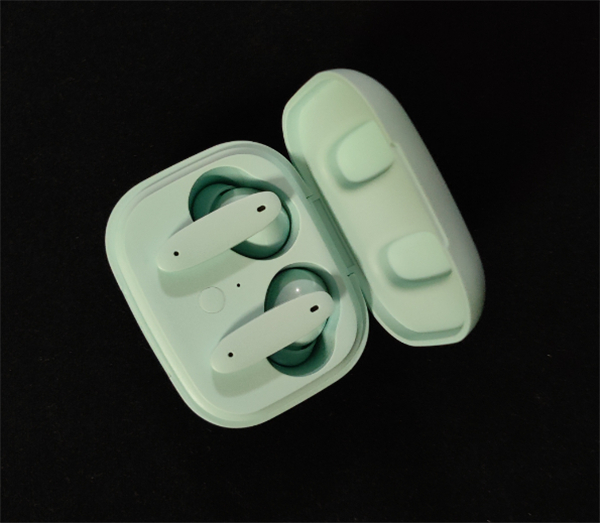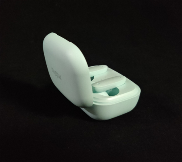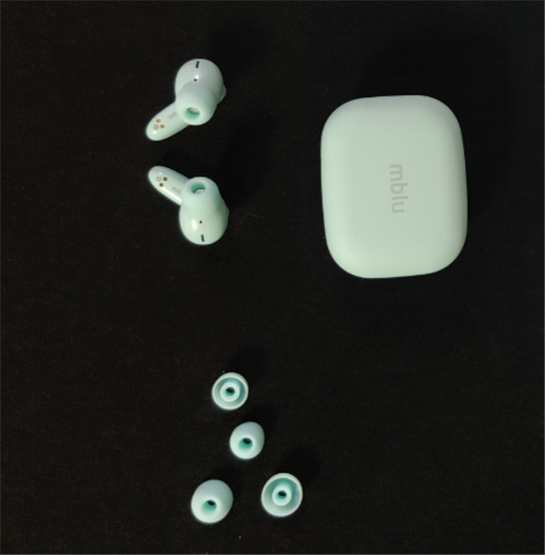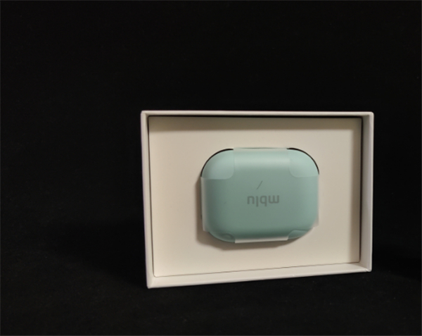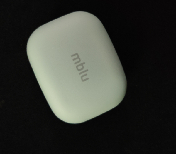 打开包装盒,入目的便是耳机充电仓了,充电仓并没有太多额外的修饰,正面印有mblu标识,但整体相当简约,整体圆润,配上天青色这种清新自然的配色,还是非常养眼的。