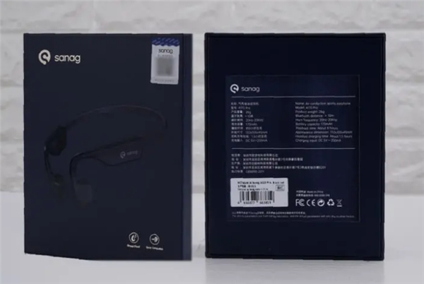 整体采用的黑色包装盒,正面除了耳机渲染效果图之外还有sanag的商标,侧边有“sports headset”头戴式运动耳机的英文。