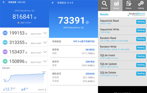 至于综合性成绩参考大家熟悉的安兔兔V9,OPPO Reno8 Pro+的总分达到了81.6W以上,其中CPU分项得分近20W,GPU分项得分31W+,性能突出。与之搭配则是LPDDR5 RAM和UFS 3.1 ROM,实测闪存读写速度也都很不错,不仅顺序读取达到了1800MB/s,顺序写入也超过了1500MB/s。