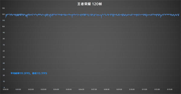 OPPO Reno8 Pro+的表现果然没有让大家失望,全程帧率保持非常稳定,平均帧率达到了119.3FPS,而且最低帧也保持在113FPS以上,相邻前后间最大帧率差没有超过8帧,保持在用户感知范围以内,实际用户体验非常流畅没有掉帧感。