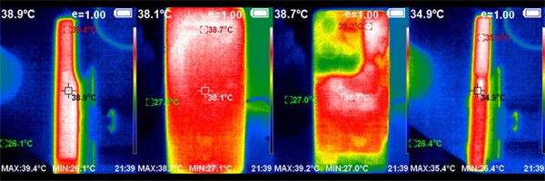 此时测量手机温度,发现也维持在一个接近的水准,手机正反面高温点都是38.2℃。