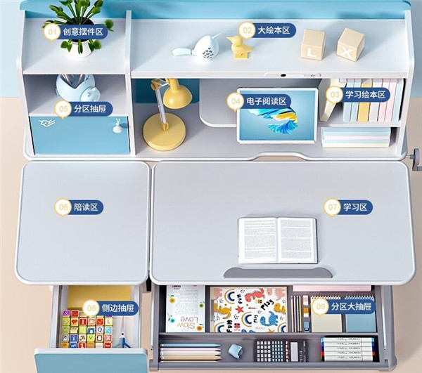 桌体部分材料使用环保板材,高于欧盟标准,坚固耐用。贴心陪读区设计,轻松享受亲自好时光。