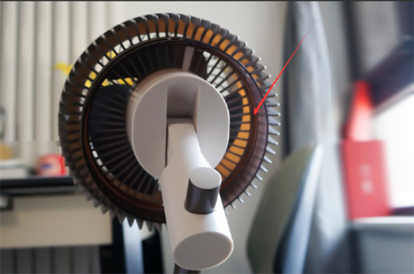 风扇的背面,大宇环绕着罩体做了一圈的灯带,并且这个灯带支持三档亮度调节,白天使用纳凉送风,晚上使用温暖入心、氛围感拉满。