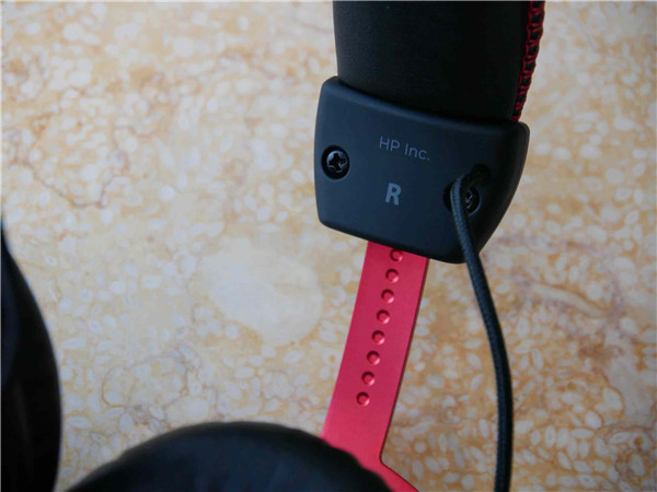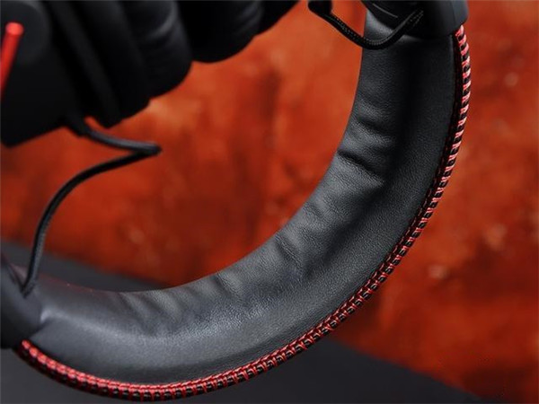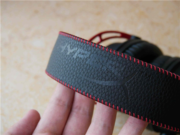 这款耳机拥有一体式可伸缩头梁以及铝合金骨架,柔韧度很不错,在大幅度弯曲拉扯下也不会造成损坏,应该是笔者接触过的HyperX头戴式耳机里柔韧度最高的。它头梁处的材质选用了蛋白皮,内部填充的记忆海绵具有不错的回弹度,佩戴后能够很明显地减少压头感。