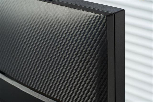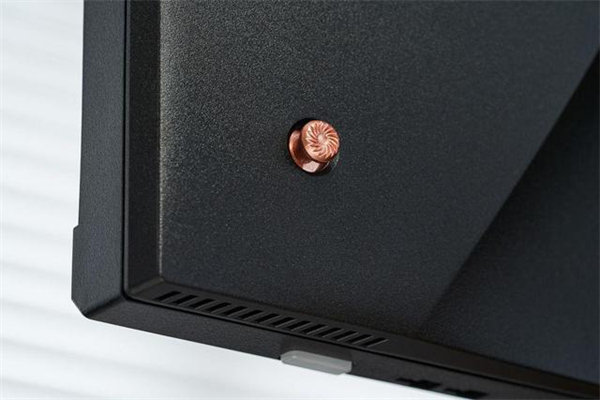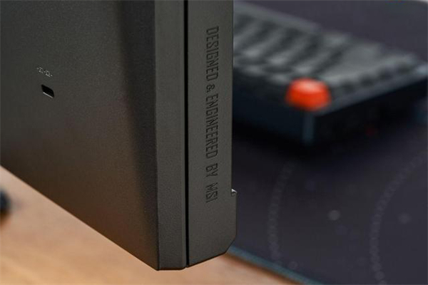 最上面的部分与微星旗下不少主板上的那些“碳纤维”材质是很相似的,应该是用了同样的工艺来处理这部分的表面;中间黑色亮光的部分可能会有朋友觉得像是RGB灯效的所在地,这个可以说是又可以说是不是,因为微星OPTIX MPG321UR-QD背面的RGB灯效是位于这个部分上方的那些透明位置内的;至于右边的部分就是利用拉丝工艺处理,左边中央部分还有MSI那个经典的加铜色龙盾徽章。