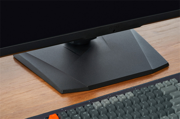 正面可以观察到,微星OPTIX MPG321UR-QD的底座并非是一般游戏显示器的那种分叉设计,而是一整块。于笔者个人而言其实这样的设计可能实用性会更高一些,一来可以在上面放一些小东西,二来也不需要占据桌面太大的空间,观感上也更为舒服。