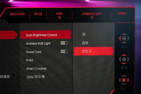 正如上面所提及过,微星OPTIX MPG321UR-QD是带有一个光亮度传感器的,因此用户只需要开启Auto Brightness Control这个功能,显示器屏幕的亮度就会根据环境亮度而慢慢调整,这样就不用担心显示器亮度与房间亮度差别太大。