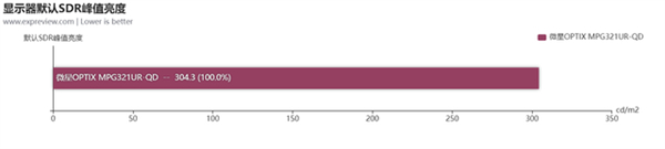 微星OPTIX MPG321UR-QD默认时亮度是在70%,测出来其默认亮度是在304 cd/m2左右。这个亮度可能会有玩家觉得太暗,但是对于一般的室内环境来说,这个亮度也是足够用的了。而如果是把亮度调至最高的话,那么显示器中心区域亮度则可以去到382.7 cd/m2.这时候屏幕平均亮度也可以达到346.4 cd/m2.