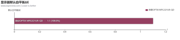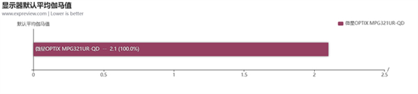 在默认模式下,微星OPTIX MPG321UR-QD的伽马值为2.10.白平衡ΔE为1.1.配合伽马曲线来看的话,这个显示器在显示30%白至90%的内容时,画面会稍为亮一点。