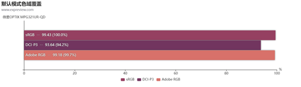 而在色域方面,微星OPTIX MPG321UR-QD在用户模式下的Adobe RGB色域覆盖为99.18%,sRGB为99.43%,而DCI-P3色域则是为93.64%。这样的色域在游戏显示器中是比较不错的。