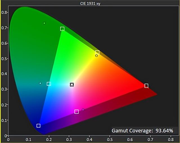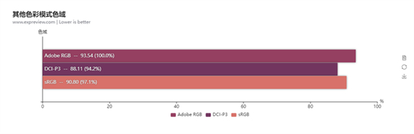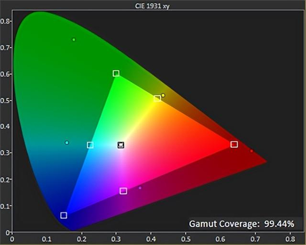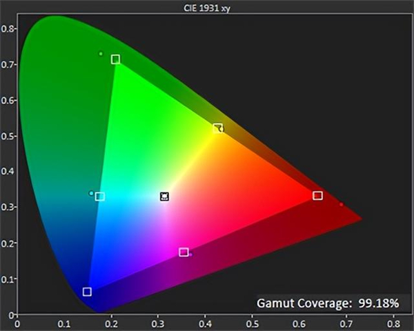 在这个客观素质测试里面我们会将显示器恢复出厂设置,然后把亮度设定100 cd/m2来测试。微星OPTIX MPG321UR-QD本身的出厂色域为Adobe RGB色域,因此测试的也是它在Adobe RGB色域内的表现。如果显示器本身有其他的色彩模式的话也会在这部分一并测量。