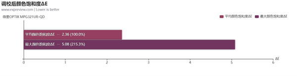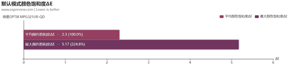 在色准这方面,微星OPTIX MPG321UR-QD的默认Adobe RGB色准平均ΔE为2.54.最大ΔE为5.15.而色彩饱和度方面则是平均ΔE为2.3.最大ΔE为5.17.这样的纸面成绩也的确是比较不错,但有一点要考虑的是,微星OPTIX MPG321UR-QD在色域溢出的问题,特别是绿色以及红色这两种颜色,所以虽然色准看着还行,但如果是想用来做创作用途的话那还是有点不够看的。