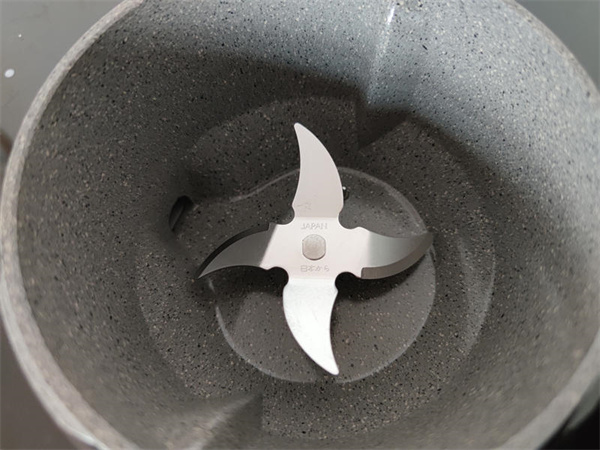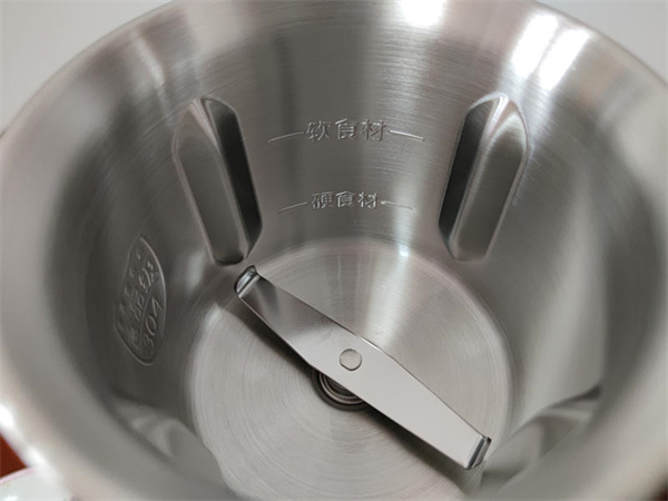 这个就是搅拌杯的腔体,可以看到腔体表面采用了麦饭石材料制作,不仅不粘同时也抗磨抗刮,刀头则采用了日本进口钢刀,搅打更细腻。