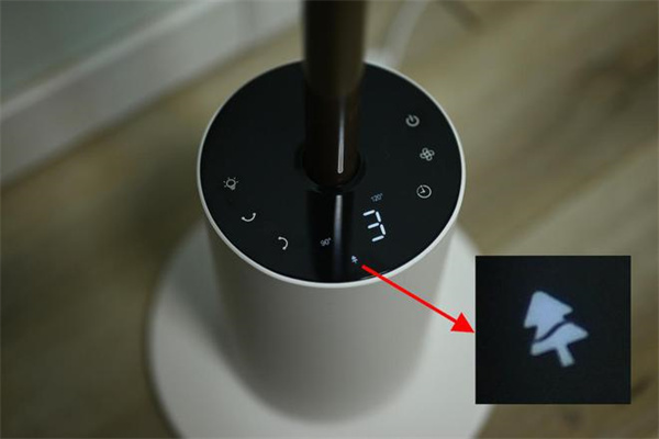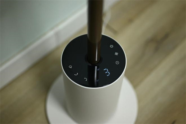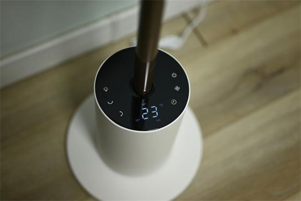 圆柱形的底座上表面是控制面板,控制面板是触屏操作,钢琴烤漆的表面很上档次,而且不会沾留指纹好评。左边是夜灯开关、左右摇头、上下摇头键,右边是开关键、风速调节和定时键。在中间的位置有一个显示屏,如果1分钟内没有其他操作,控制面板就会自动熄屏。