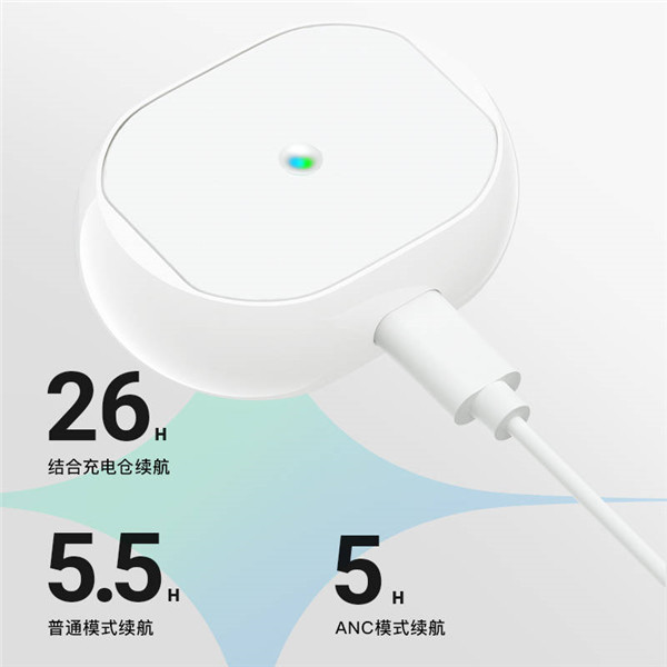 续航方面,耳机正常模式续航时长达5.5小时,开启ANC模式/通透模式时续航则是5小时,配合充电仓使用,耳机综合续航时长可达26小时。