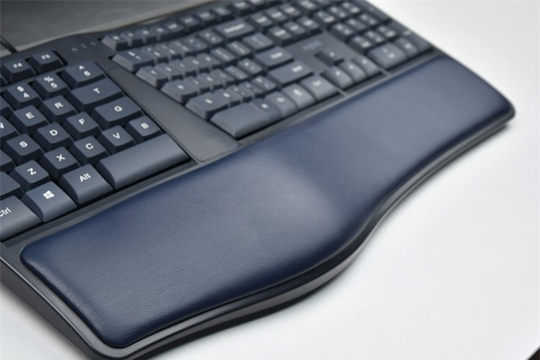 雷柏NK8800人体工学有线键盘自带PU材质腕托,与键盘固定在一起,无法拆卸。腕托表面触感细腻,腕放上去不会打滑。内部填充物材质比较柔软,与键盘表面的曲线高度变化相契合,靠近主键区部分的表面积更大一些,并且高度也有所增加,过渡自然,在使用的时候可以增加不少舒适性,符合两只手腕的自然摆放角度。适当垫高手腕可以减少打字过程中手掌的悬空时间,从而减少疲劳度,达到保护手腕的目的。