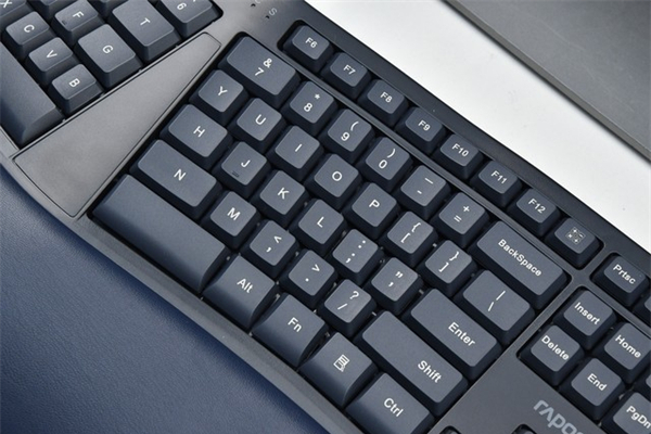 雷柏NK8800人体工学有线键盘的键帽采用了ABS材质,表面触感细腻顺滑。它的字符采用了镭雕工艺,可以在许多办公薄膜键盘上见到。