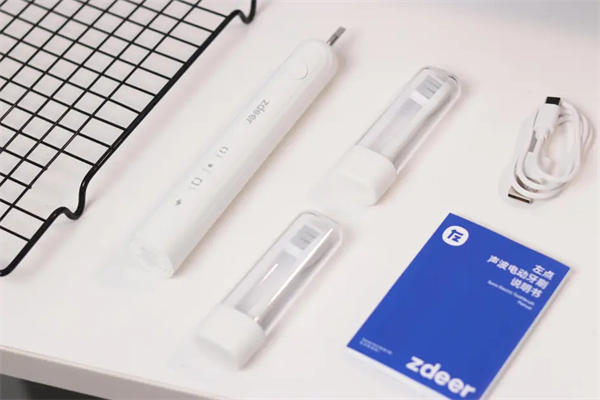 打开包装,里面的配件映入眼帘。除了牙刷主机以外,直接标配了两个刷头,诚意是足的。另外,还有一本说明书和一根C口的数据线。