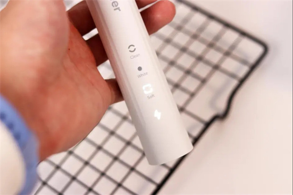 机身下方区域是LED显示区,这里可以看到三种刷牙模式和一个电源指示灯,还是相当直观的。使用的时候,背景LED灯亮起,配合这个白色机身,感觉效果更好看。
