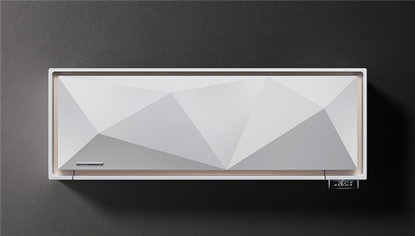 云米AI全域风空调pace E正面面板设计非常优雅。面板并不是弧形或纯平,而是带有类似钻石切割的特殊纹理,面板左下角是带有云米logo图案以及SPACE-E的金属铭牌。钻石切割气浮面板的右下角是一个的3D棱镜显示屏,它像一块凌厉的水晶镶嵌在空调的下部。