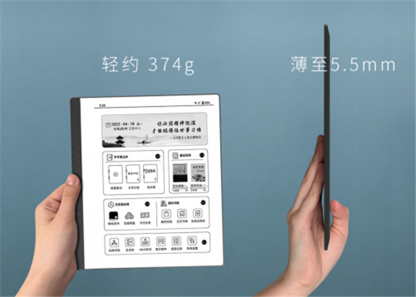汉王手写电纸本N10薄至5.5mm,轻约374g,纤薄精致,就像一本纸质本,以单手握持的实力,让用户体验不一般的畅轻体验。