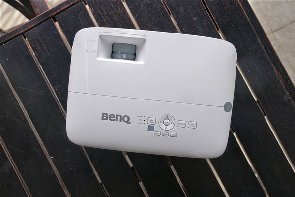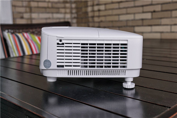 它的机身正面一个全玻璃镜头占据了几乎一半的面积,剩下的另一半印有明基 BenQ的英文 LOGO;考虑到商用环境下的用户体验,机器将散热模组的一半出风口做到了正面,可以有效避免热风直吹坐在侧面的人,是一个比较贴心的细节。