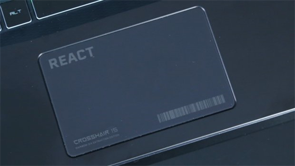 触板表现出了“神枪手”和《彩虹六号:异种》的元素互动,上面印刷着灰白色的“REACT”和“CROSSHAIR 15”字样,分别代表了《彩虹六号:异种》和微星神枪手系列游戏本。