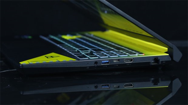 机身右侧的接口相比左侧更为丰富,配置了1个RJ45的有线网孔、1个HDMI视频输出接口、1个USB3.2 Gen1 Type-C接口、1个USB3.2 Gen1 Type-A接口,以及一个3.5mm的音频输出接口。