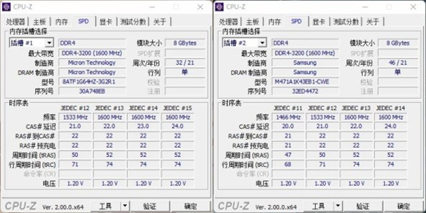 配置了2根8GB容量的DDR4内存,一根来自美光一根来自三星,共同组成16GB双通道方案,内存频率均为3200MHz,时序为22-22-22-52.