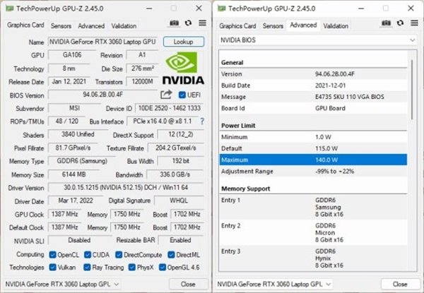 搭配一块140W的满血版NVIDIA GeForce RTX 3060 Laptop独立游戏显卡,在MSI Center中开启极致模式后,核心频率能够达到1387/1702MHz。