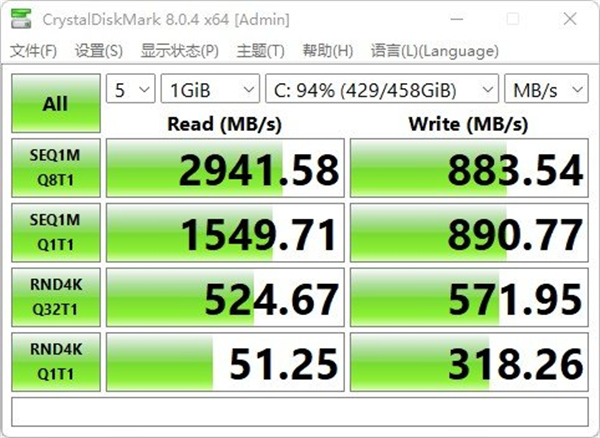 CrystalDisMark测试,连续读写速度为2941.58MBs/s、883.54MB/s,4K随机读写速度为524.67MB/s、571.95MB/s。