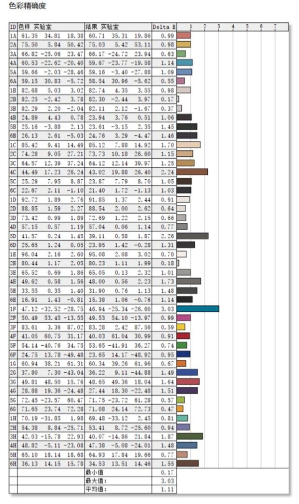 色彩精确度测试的DelteE平均值为1.11.整体表现非常不错,能够为玩家提供非常精确的色彩表现。