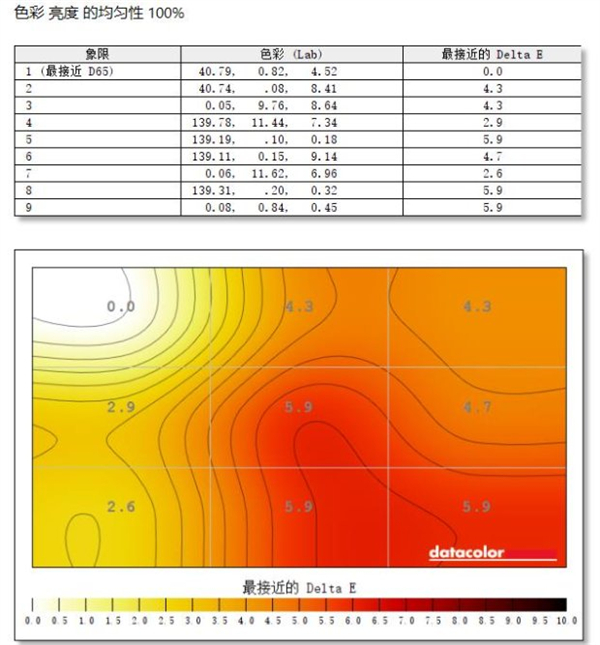 在色彩亮度均匀性测试中,象限1最接近D65.象限5、6、8、9的差异值最大,但最大差异值也仅有5.9而已。