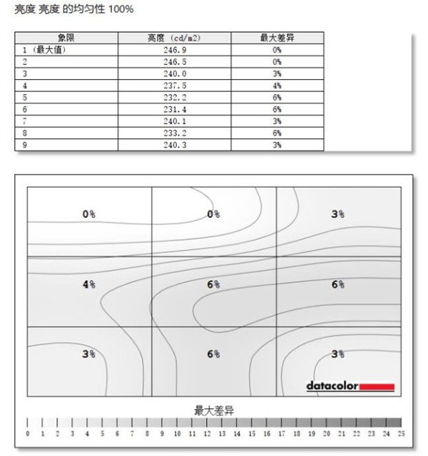在亮度均匀性测试中,象限5、6、8的差异值较大,最大差异值仅为6%。