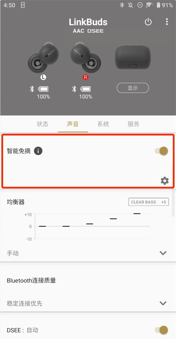关于音质部分笔者还想再补充2点,在索尼自家的App里,用户可开启「DSEE」数字声音增强引擎。之前有用过索尼蓝牙耳机的用户对「DSEE」一定不陌生,简单来说就是利用索尼先进的算法对音源采样率的补全,恢复这部分损失的高频声音,从而提升音质,让听感更为丰富和饱满。此按钮我一直都是默认开启状态,后续有入手LinkBuds的同学可以试听感受下。