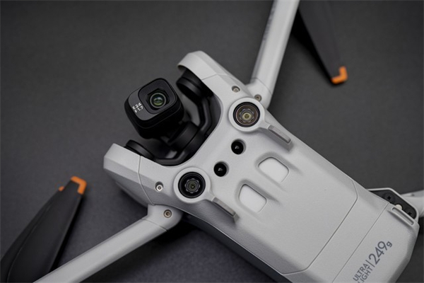 DJI Mini 3 Pro采用了全新的脚架设计,它设计在无人机的底部,下视视觉相机的旁边。这样机臂上就无须脚架设计,进而达到减重的效果。而且大疆通过测试,即使在一些凹凸不平的地面上降落,这个新脚架的高度也可以保护下视相机的安全,不会撞击地面造成损坏。