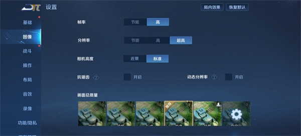 在《王者荣耀》中,我们将帧率改为高、分辨率改为超高,画面总质量默认为高清。