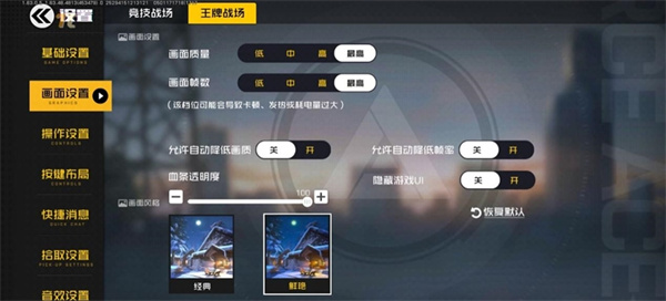 在《王牌战士》中,我们将竞技战场和王牌战场的游戏画面质量和画面帧数改为最高,允许自动降低画质和帧率关闭。