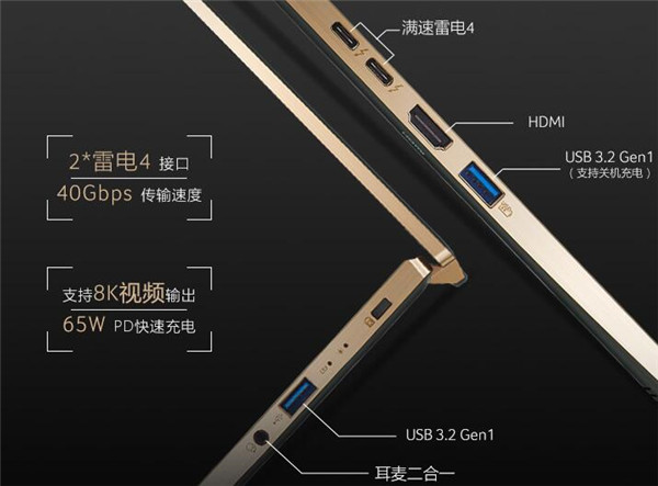 接口边框采用45°斜切亮边设计,自带高光闪耀细节尽显高端品质。双满速雷电4接口,40Gbps传输速度,支持8K视频输出,支持65W PD快速充电。