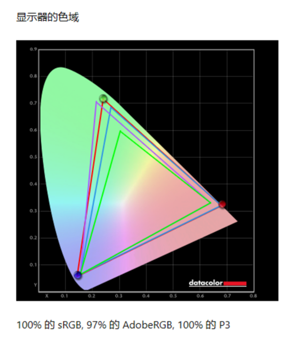 实测这块屏幕覆盖100%sRGB、100%DCI-P3色域、97%AdobeRGB,最大亮度369尼特、平均色准0.68.色彩鲜艳,还原度高,加上高分辨率、HDR 400的色彩认证,可以进行一些对颜色要求较高的图片设计工作。