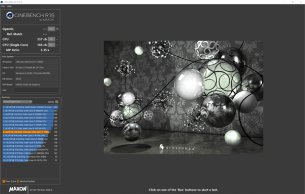 CINEBENCH R15:多核性能557cb,单核性能166cb;