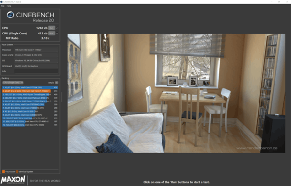 CINEBENCH R20:多核性能1282cb,单核性能413cb;